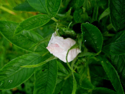Kävin pari kesää sitten Pattijoen entisen kunnantoimiston roskaläjässä erään virkanaisen johdattelemana ja summamutikassa nostin sieltä muutaman juurakon autooni. Sitten olenkin jännittyneenä seurannut mitä niistä nousee. Tämä yksilö on ainakin Hansa, luulen. Eräs toinenkin on, joten istutin sen tänään toisen viereen. Kurttutarhassa taitaa olla mukana pari yksinkertaista kurtturuusua, jotka siirrän vielä toiseen paikkaan.